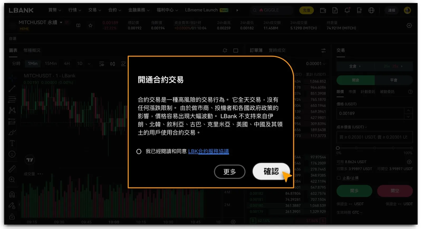 訪問LBank官網,登錄後點擊導航欄「合約」,選擇或搜索意向交易對進入交易頁面後,同意合約賬戶開戶協議並確認,即完成開戶。