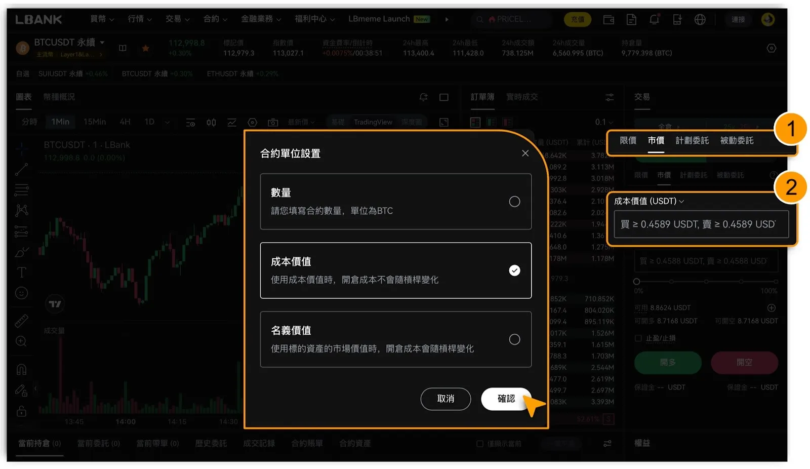 開倉訂單類型:點擊選擇「訂單類型」以及設置「合約單位」。