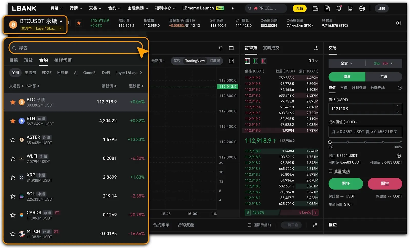 選擇合約:進入「合約」頁面,點擊左上方目標交易對,在下方彈出的菜單中,搜索或使用條件設定,瀏覽交易對(如 BTC/USDT,ETH/USDT等)。