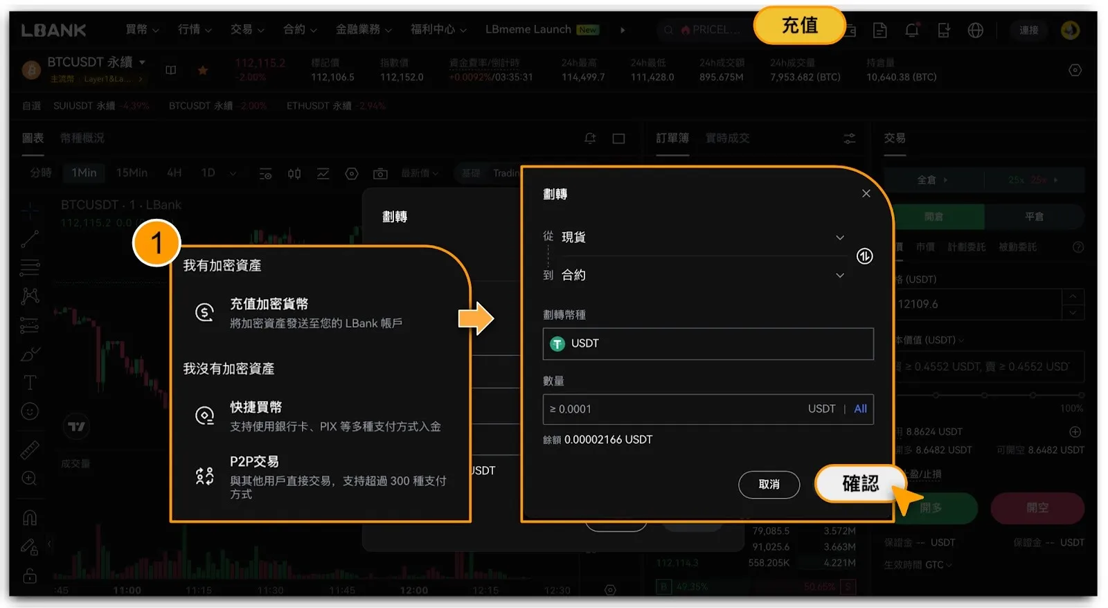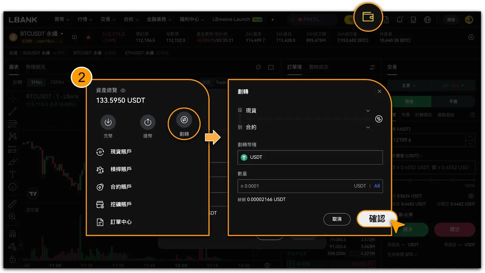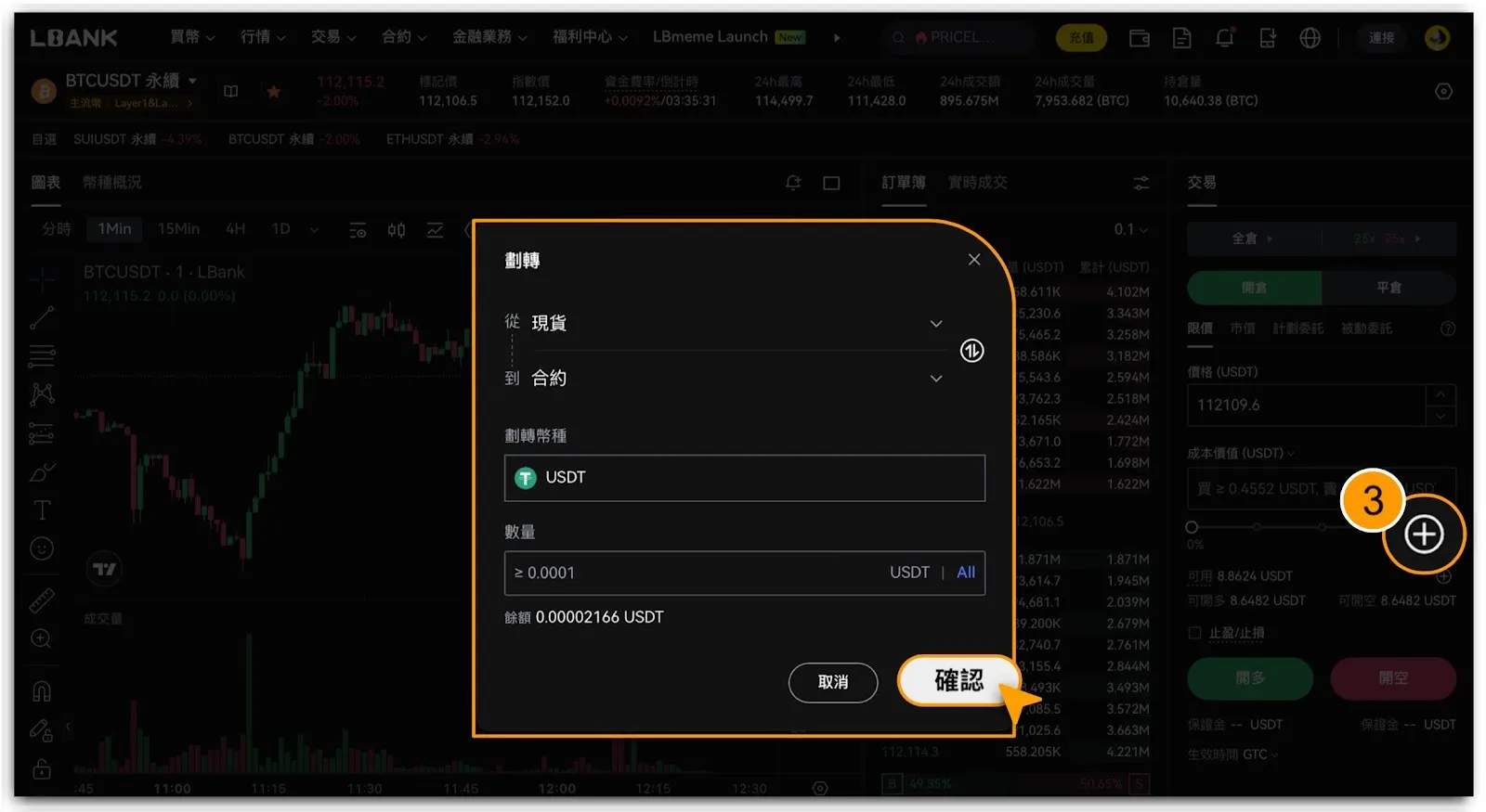 轉入資金:從現貨賬戶轉移 USDT 等保證金至合約賬戶。