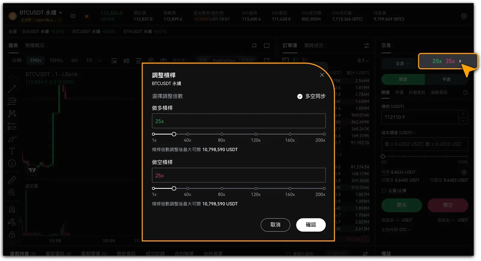 槓桿調整:每筆合約前,在交易對詳情中滑動調整槓桿(1-125 倍,按每個交易對情況而定)。高槓桿放大收益與風險,建議新手從低槓桿起步。
