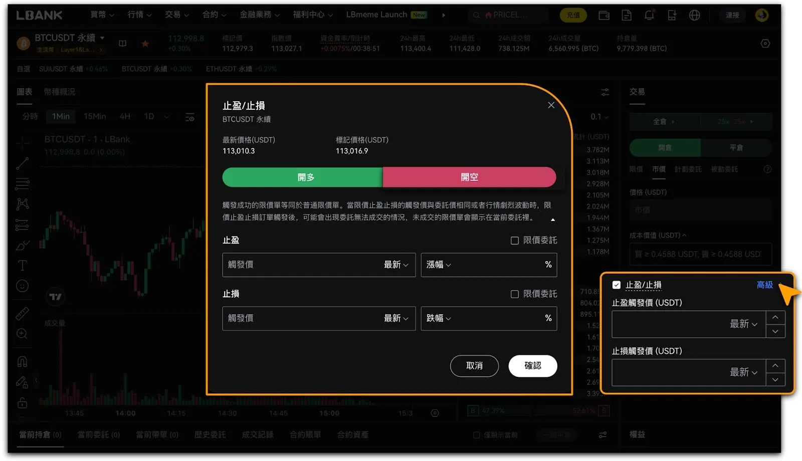止損/止盈單:結合止損(Stop Loss,限制虧損)和止盈(Take Profit,鎖定收益),預設觸發價格。如圖,下單時可點擊「高級」設置「止盈/止損」。