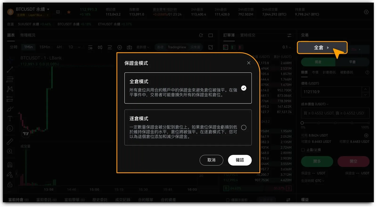 保證金模式:支持隔離保證金(Isolated,每筆交易獨立風險)和全倉保證金(Cross,全賬戶共享)。開倉前在交易界面切換模式,持倉後不可更改。