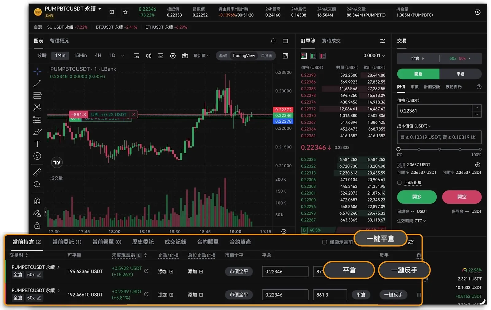 一鍵反手:是LBank合約交易中的便捷功能之一,允許用戶以當前持倉的相同數量和方向反向開倉(如多頭轉空頭),自動平掉原有持倉並建立新倉位,適合快速應對市場轉折以鎖定利潤或止損。
