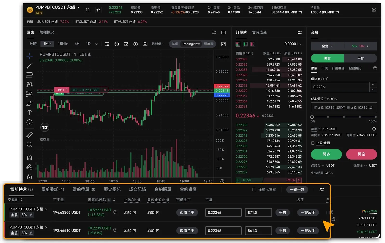 交易訂單:顯示買賣盤深度,列出多個價格層次及相應訂單量,可切換查看「訂單簿」或「實時成交」模式,幫助用戶判斷市場供需情況並制定交易計劃。