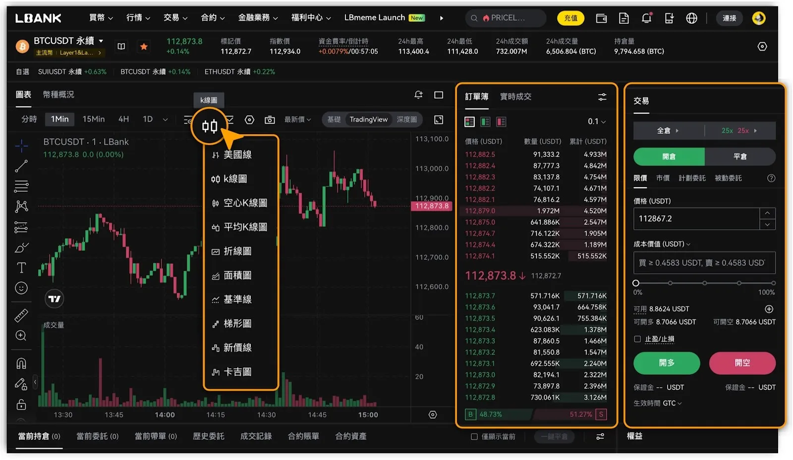 選定目標交易對後,點擊進入交易界面,查看 K 線圖、深度圖與最新價格;請根據個人偏好選擇設置圖表。